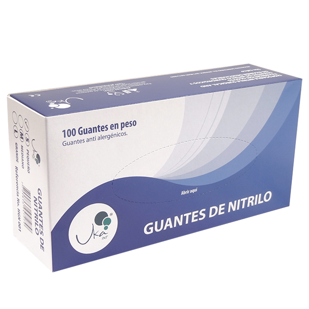 Guantes de Nitrilo Calibre 8 Uka Int x100 unidades — Guantes desechables de alta resistencia mecánica y excelente flexibilidad, fabricados en caucho de nitrilo sintético, libres de látex, silicona y talco. Diseñados para aplicaciones médicas, industriales, alimentarias y de alto riesgo.