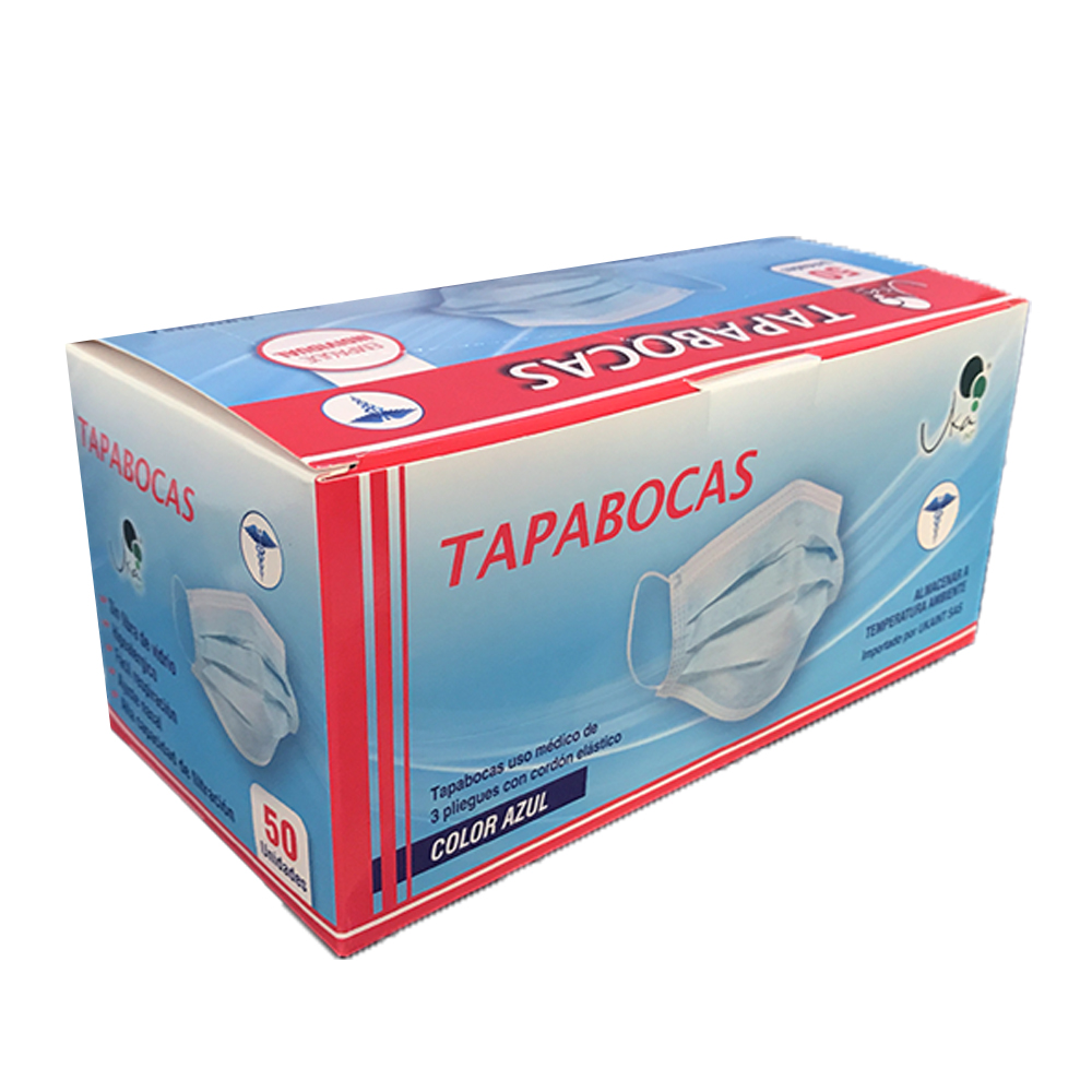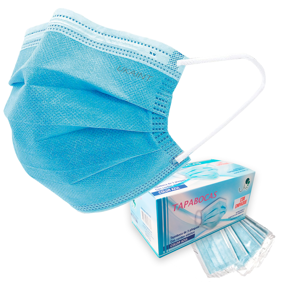 Tapabocas azul con empaque individual Uka Int x50 unidades — Mascarilla facial desechable termosellada por ultrasonido, de 3 capas de protección y con registro sanitario INVIMA 2023DM-0027663. Ideal para uso médico, industrial y personal.