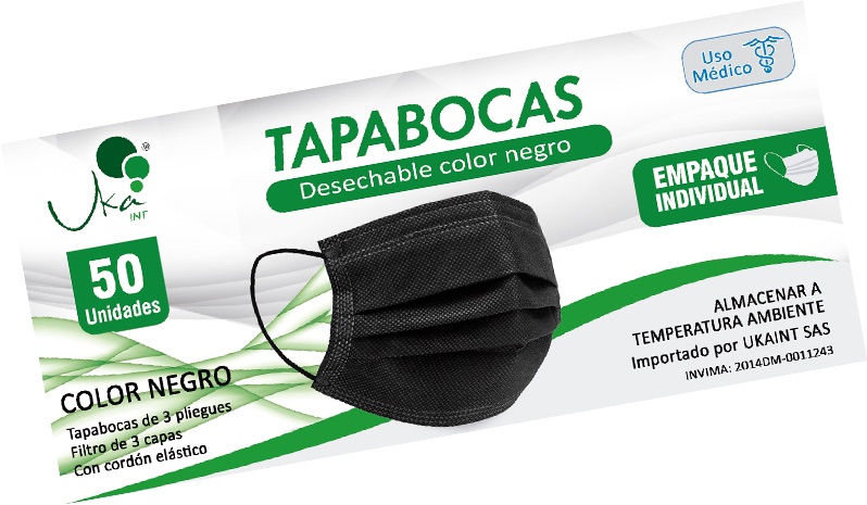 Tapabocas negro con empaque individual Uka Int x50 unidades — Mascarilla facial desechable termosellada por ultrasonido, de 3 capas de protección y con registro sanitario INVIMA 2023DM-0027663. Ideal para uso médico, industrial y personal.